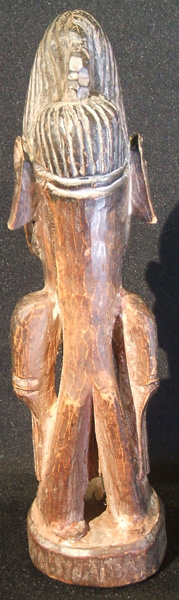 Twins are considered to be powerful spirits, so upon the death of one or both twins, the ibeji, a small wood figure, is carved to represent the deceased child.  The ibeji is treated just as if the child were still alive.  It is bathed. clothed, fed and generally looked after by the mother to assure that only good fortune is brought to the family. Ibejis are not carved to look like children but instead they appear as either male or female adults.